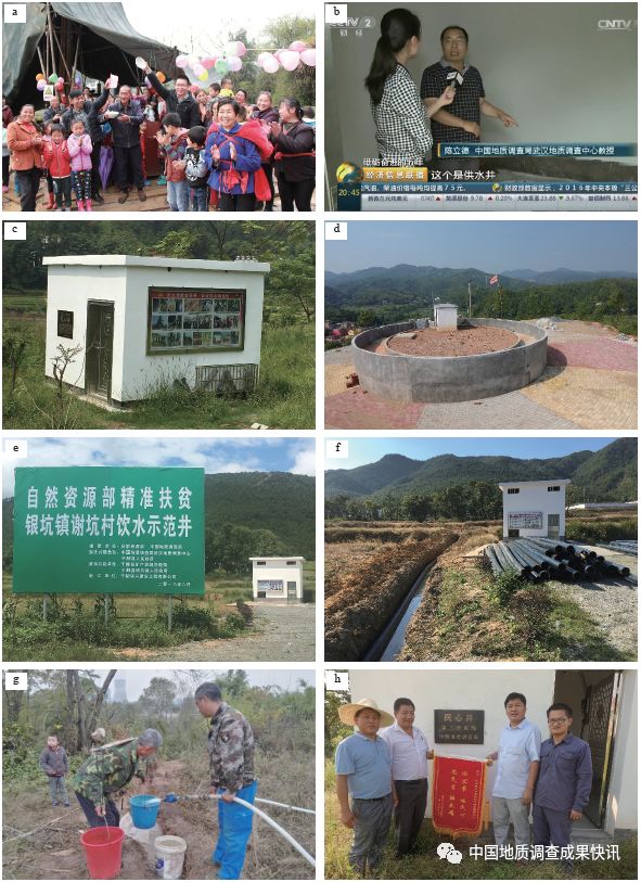 a—当地村民庆祝夏潭2井成功出水;b—央视媒体宣传报道夏潭饮水工程;c—主供水泵房;d—高位蓄水池;e—谢坑饮水示范井;f—当地配套管网工程施工;g—供水前缺水群众到钻井处挑水饮用;h—示范井供水后当地呈送锦旗感谢